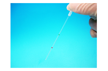 検体採取用ピペットの先端から1目盛り(5μL)血清検体を採取します。