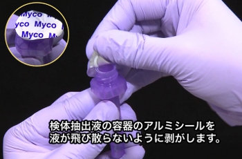 検体抽出液の容器のアルミシールを液が飛び散らないように剥がします。