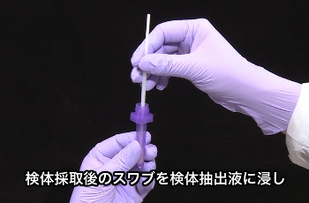検体採取後のスワブを検体抽出液に浸す。